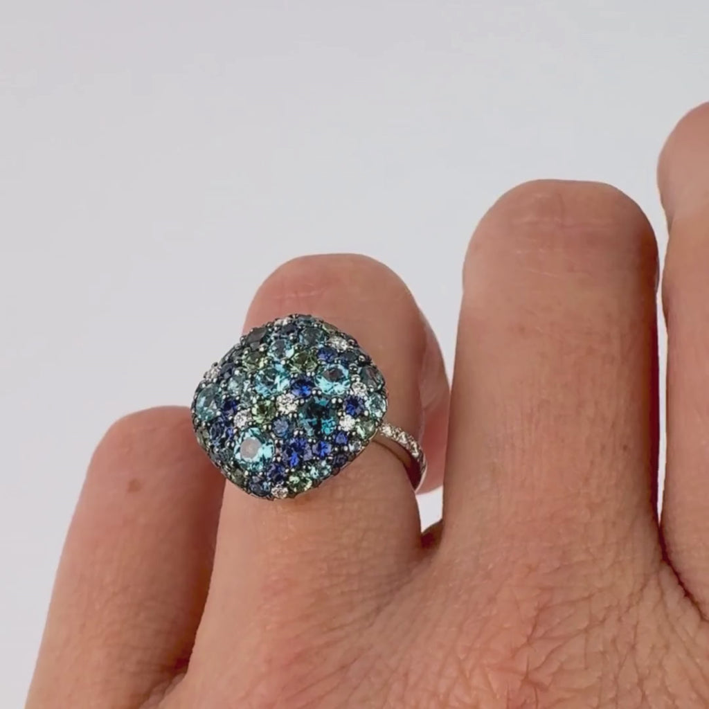 Elevate your everyday elegance with this stunning 18ct white gold dress ring, a masterpiece of colour and brilliance. Featuring a captivating 1.69ct round blue topaz as the centrepiece, complemented by vibrant green tourmalines (0.50ct) and rich blue sapphires (0.83ct), this ring celebrates sophisticated gemstone artistry. Delicate pave-set round brilliant diamonds (0.33ct) frame the design with timeless sparkle, creating a harmonious blend of precious stones that catches light from every angle. Perfect for special occasions or as a statement piece that transforms any moment into something memorable.