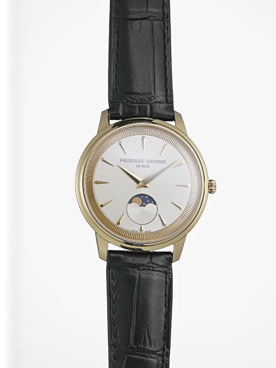 The Classics Moneta Moonphase collection from Frederique Constant features a fluted flange reminiscent of the edge of a coin, which inspired its name. Available in a 37 mm case, each piece is powered by a quartz movement that makes the watch as desirable as it is affordable. The timepieces in this collection are distinguished by a finely sunrayed dial and a moon phase at 6 o’clock. This model stands out with its polished stainless steel case, treated with yellow gold PVD. The dauphine hands and applied hour markers, also in yellow gold, give the piece a classic, high-end look. The silver dial has a sunray finish. The watch is protected by a convex anti-reflective sapphire crystal and is water-resistant to 5 ATM. It is mounted on a dark brown calfskin leather strap with an embossed crocodile pattern and fastens with a pin buckle.