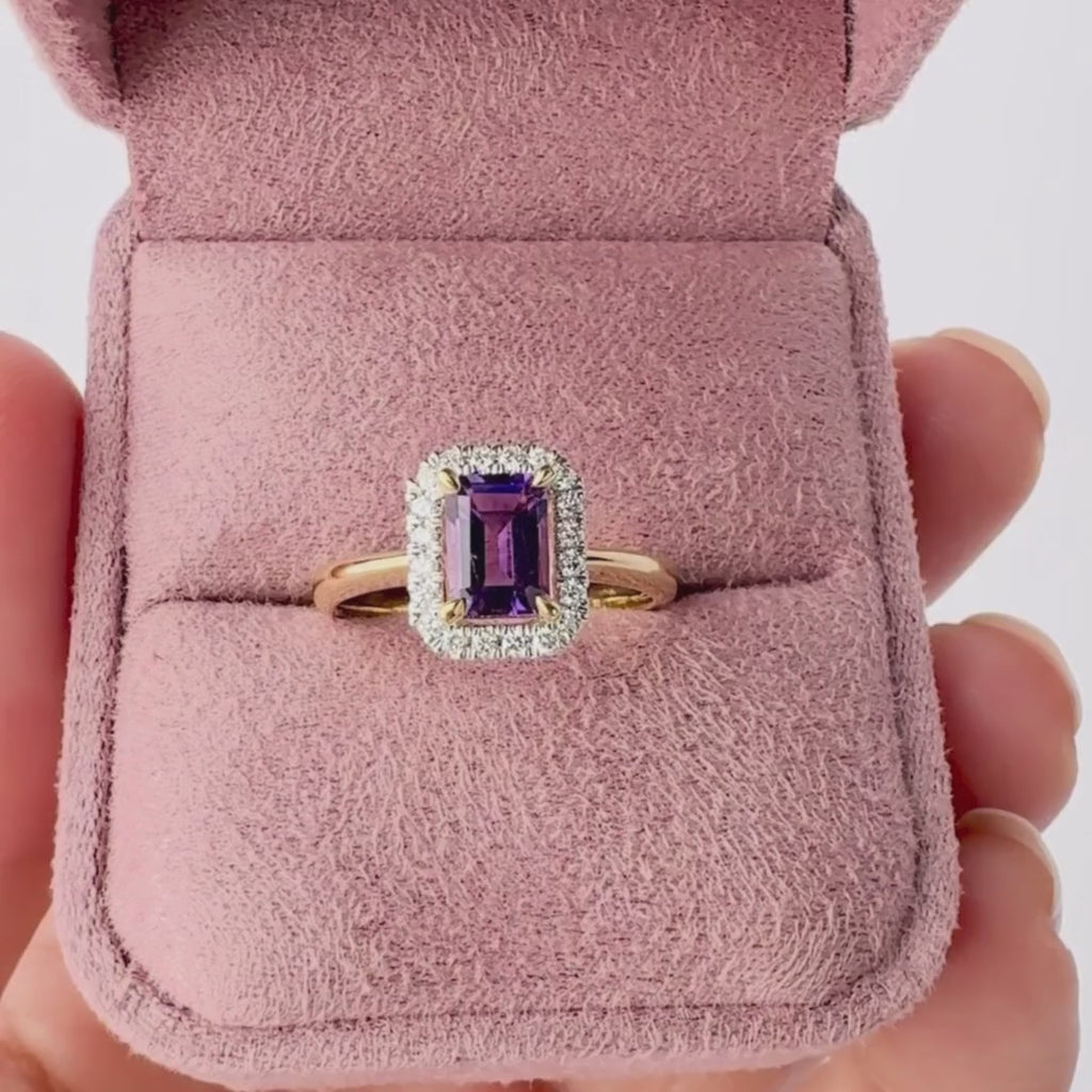 Elevate your elegance with this stunning 9ct yellow gold halo ring, featuring a captivating 7 x 5mm emerald cut amethyst at its heart. Surrounded by a shimmering halo of twenty round brilliant cut diamonds (0.16ct total, HI/P1 clarity), this piece combines timeless sophistication with modern sparkle. The claw and carcelated settings ensure secure, lasting brilliance. Perfect for those who appreciate distinctive gemstone jewellery with exceptional craftsmanship and enduring beauty.